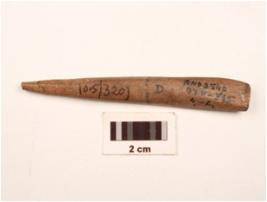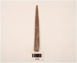 | Description / विवरण | A charred bone point intact distal end partly chipped off proximal end polished visible hollow side broken from the middle rejoining. |