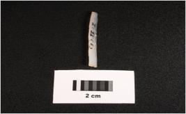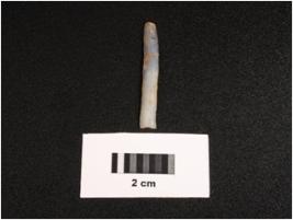 | Description / विवरण | Parallel side microlithic blade with improminent double ridge on dorsal. Trapezoid in section. Use wear marks on cutting edges. |