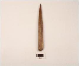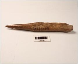 | Description / विवरण | A modified charred bone point polished smooth surface intact distal and proximal ends visible hollow side chipped off surface. |