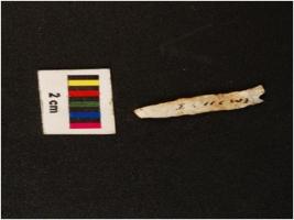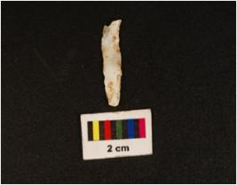 | Description / विवरण | Pen knife shaped chert blade, proximal end, mid-ridge on dorsal, flat ventral, irregular edges. |