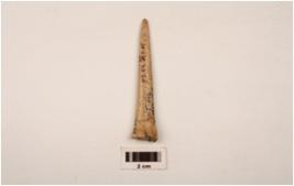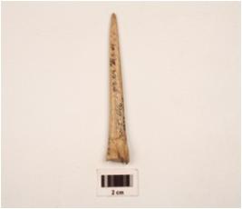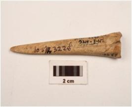 | Description / विवरण | A modified bone point polished distal end is intact, proximal end slightly chipped off, smooth surface cracks on the upper part of the point, visible hollow side. |