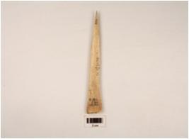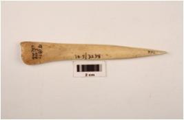 | Description / विवरण | A point made on bone with polished surface one end thickened, broken tip. |