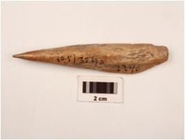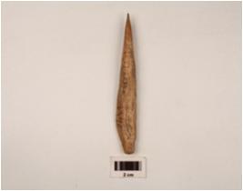 | Description / विवरण | A point made on bone with polished surface, cracks on surface, one thickened end. |