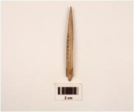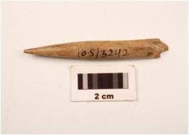 | Description / विवरण | A point made on bone with polished surface, one thickened end, cracks on surface. |