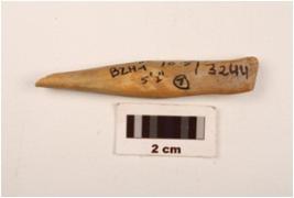 | Description / विवरण | A point made on bone with polished surface, slightly broked from pointed end, one thickened end. |