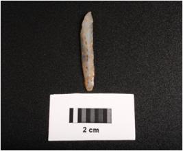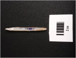 | Description / विवरण | Microlithic blade with tapering end and prominent mid ridge on dorsal. Triangular in section and diffused bulb on proximal end. |