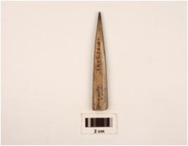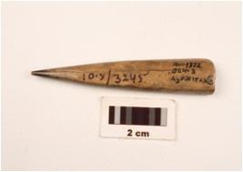 | Description / विवरण | A point made on bone with polished surface, one thickened end, slightly broked from pointed end. |