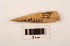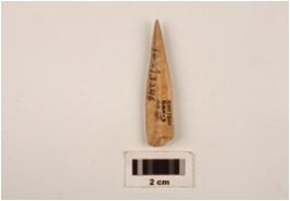 | Description / विवरण | A point made on bone with polished surface, one thickened end. |