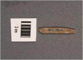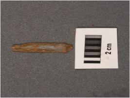 | Description / विवरण | Chalcedony parallel sided blade with a single ridge, triangular section, regularly retouched edges, broken proximal end. |