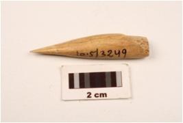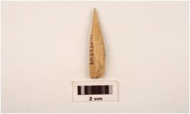 | Description / विवरण | A point made on bone with polished surface, one thickened end, cracks on surface. |