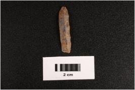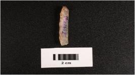| Description / विवरण | Parallel sided microlithic blade with a prominent mid ridge on dorsal side, diffused bulb on ventral side, use wear marks along cutting edges and broken at distal end. |