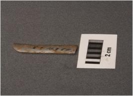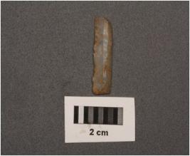 | Description / विवरण | Parallel sided blade, use wear marks on both cutting edges, both the ends are broken, one vertical ridge on dorsal surface, concave ventral surface. |