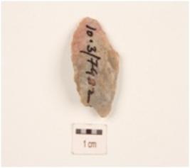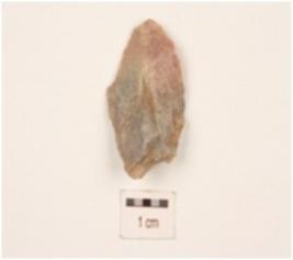 | Description / विवरण | A blade made on chert, ridge on dorsal surface, use-wear marks on working edges, triangular in section and prominent bulb on ventral side. |