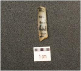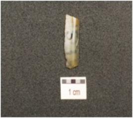 | Description / विवरण | Fragment of parallel sided chalcedony blade with double ridge on dorsal, trapezoid in section, use wear marks on cutting edge and broken along both ends. |