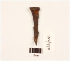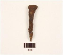 | Description / विवरण | A nail made on iron. Pointed on one end and other end is broad. Rusted surface. |