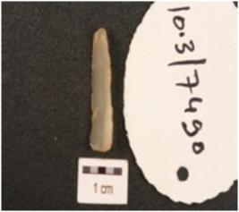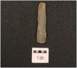 | Description / विवरण | A blade made on quartz with a mid ridge on dorsal surface, use-wear marks on working edges, triangular in section and diffused bulb. |