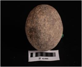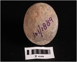 | Description / विवरण | A terracotta circular shaped sling ball, smooth surface, surface treated with black wash and circular in section. |