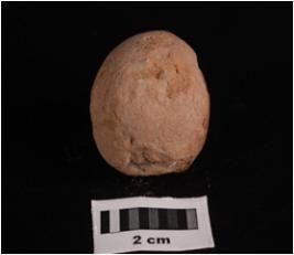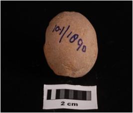 | Description / विवरण | A circular shaped terracotta sling ball, smooth surface and surface slightly chipped off. |