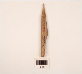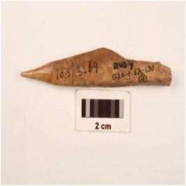| Description / विवरण | A arrow head made on bone with polished surface, one thickened end. |