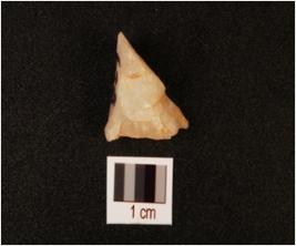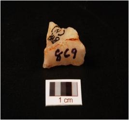 | Description / विवरण | Quartz flake with use wear marks on working edge and flake scars on surface, smooth and cortex on surface. |