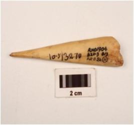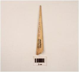 | Description / विवरण | A point made on bone with polished surface, slightly broken from pointed end, one thickened end. |