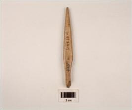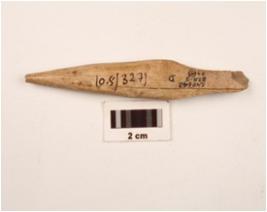 | Description / विवरण | A arrow head made on bone with polished surface, slightly broken from pointed tip, square in section, cracks on surface. |