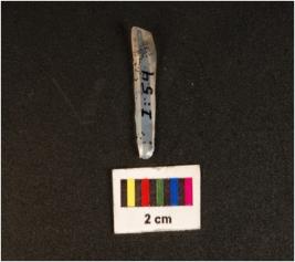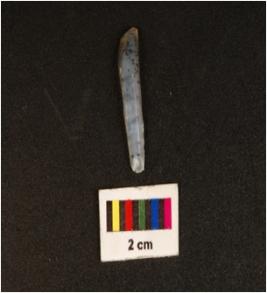 | Description / विवरण | Parallel sided chalcedony blade, mid-ridge on dorsal, flat ventral, diffused bulbs, use wear edges. Traces of black points on surface. |
