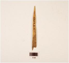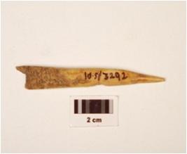 | Description / विवरण | A bone point with polished surface, pointed tip, broken from one end. |