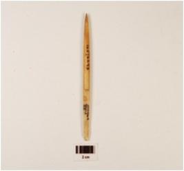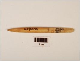 | Description / विवरण | A bone point with polished surface, pointed tip, partly broken from one end. |