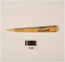| Description / विवरण | A bone point with polished surface, pointed tip partly broken, chemically treated, broken at one end. |