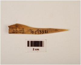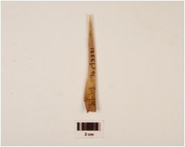 | Description / विवरण | A bone arrow head with polished surface, pointed tip, broken at one end, chemically treated. |