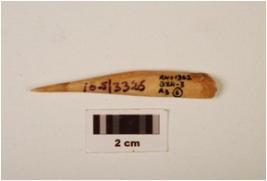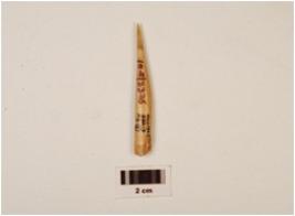 | Description / विवरण | A bone point with polished surface, pointed tip, broken at one end, chemically treated. |