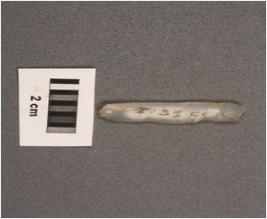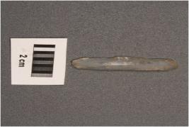 | Description / विवरण | Parallel sided blade with one weavy and another straight cutting edges, use wear marks on cutting edges, diffused bulb with striking platform at proximal end, distal end broken. |