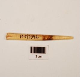 | Description / विवरण | A bone point, polished, broken proximal and, distal end, smooth surface. |