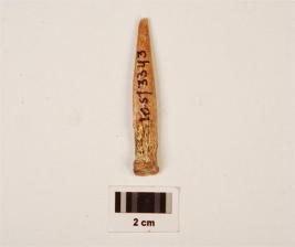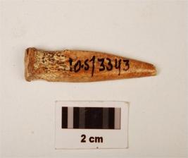 | Description / विवरण | A bone arrow head with polished surface, slightly chipped off tip, broken at one end. |