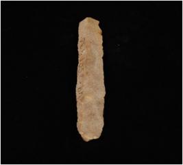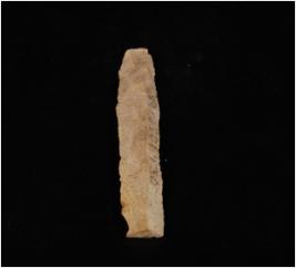 | Description / विवरण | Parallel sided blade on chert with double ridges on dorsal side, smooth ventral, trapezoid section and use wear marks on the cutting edge. |