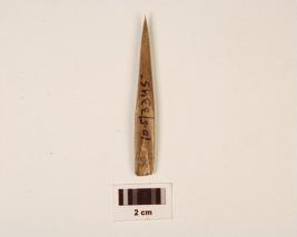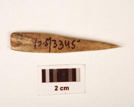 | Description / विवरण | A bone arrow head with polished surface, pointed tip, broken at one end, charred. |
