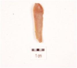 | Description / विवरण | A chert blade mid ridge on the dorsal side, prominent bulb on the ventral side, prepared platform distal end intact and use wear marks on the cutting edges. |