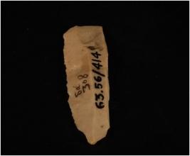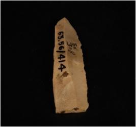 | Description / विवरण | Parallel sided blade on chert with double ridge on dorsal side, smooth ventral, trapezoid section and use wear marks on the cutting edge. |