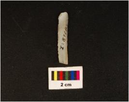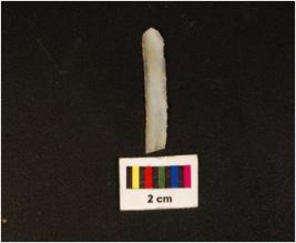 | Description / विवरण | Parallel sided chalcedony blade, mid-ridge on dorsal, irregular edges, proximal end. |