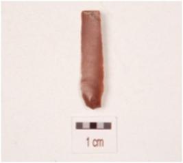 | Description / विवरण | A chert blade mid ridge on the dorsal side, prominent bulb on the ventral side, prepared platform distal and intact and use wear marks on the cutting edges. |