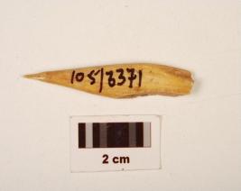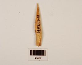 | Description / विवरण | A arrow head made on bone with polished surface broken at one end, slightly chipped off tip. |