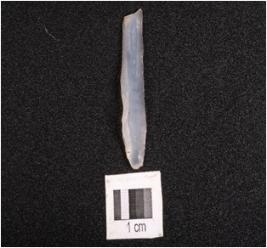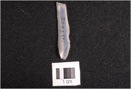 | Description / विवरण | Parallel sided microlithic blade with two ridges on dorsal side, diffused bulb on ventral side, use wear marks on cutting edges and broken at distal end. |