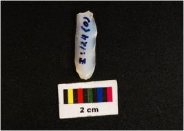 | Description / विवरण | Parallel sided microlithic blade with use wear marks on cutting edges and inprominent double ridge on dorsal. Diffused bulb on proximal end. |