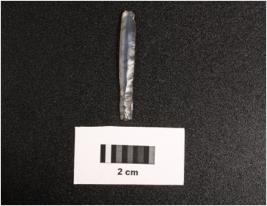 | Description / विवरण | Parallel sided backed blade with two ridges on dorsal side, diffused bulb on ventral side, trapezoidal in section, broken at distal end and from one cutting edge. Use wear marks on cutting edges. |