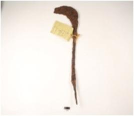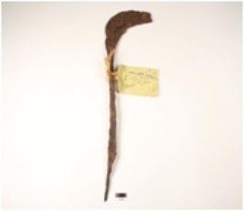 | Description / विवरण | A sickle made on iron curved and sharp at one end, other end is pointed, rusted surface. |