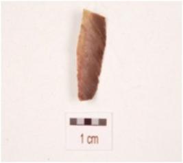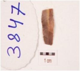 | Description / विवरण | A chert blade mid ridge on the dorsal side, prominent bulb on the ventral side, prepared platform and use wear marks on the cutting edges. |