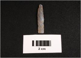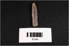 | Description / विवरण | Paralled sided chalcedony blade, flat ventral side, use wear, two ridge dorsal. |