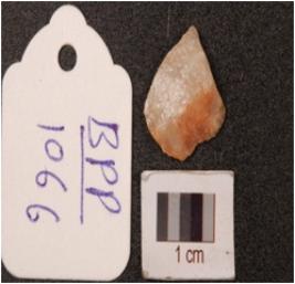 | Description / विवरण | A quartz flake with trapezoid shaped and cortex on dorsal sides. |