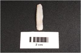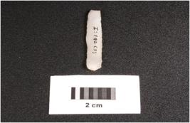 | Description / विवरण | Microlithic blade on chalcedony with prominent double ridge on dorsal, trepizoidal in section, use wear marks along the cutting edges, bulb on proximal end. |